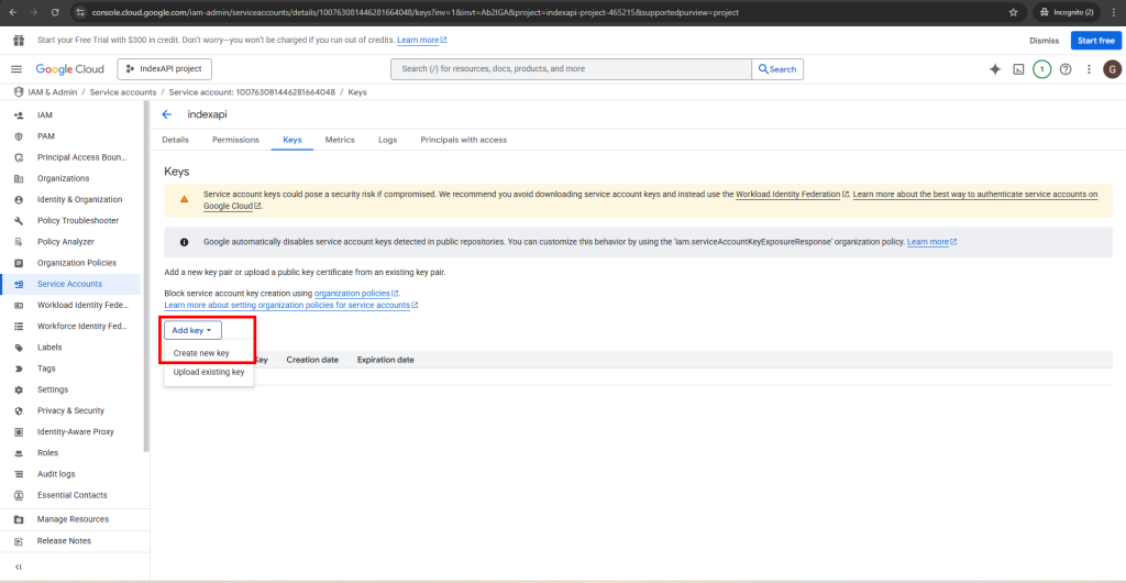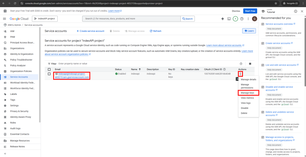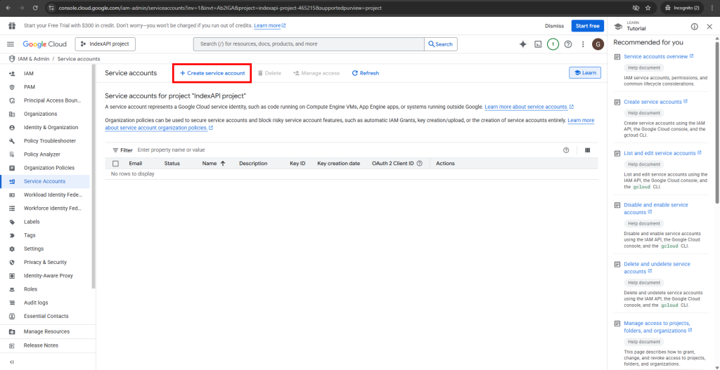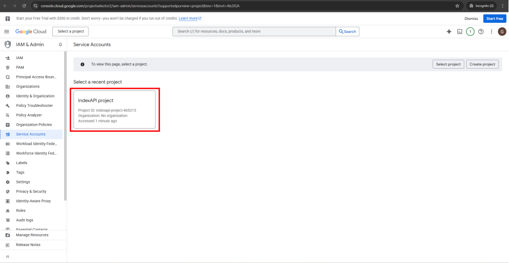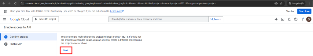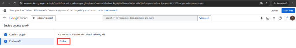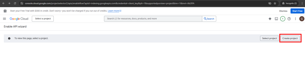برای اتصال به سرویس ایندکس API شما باید یک پروژه در بخش توسعه دهندگان گوگل ایجاد کنید و کلید اعتبار سنجی آن را دریافت کنید و در پنل کاربری ثبت نمایید. راهنمای قدم به قدم انجام این کار را می توانید در این راهنما دنبال کنید.