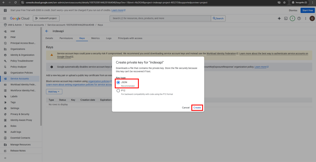 مورد انتخاب شده برای بخش Key type را بر روی JSON قرار دهید و بر روی Create کلیک کنید.