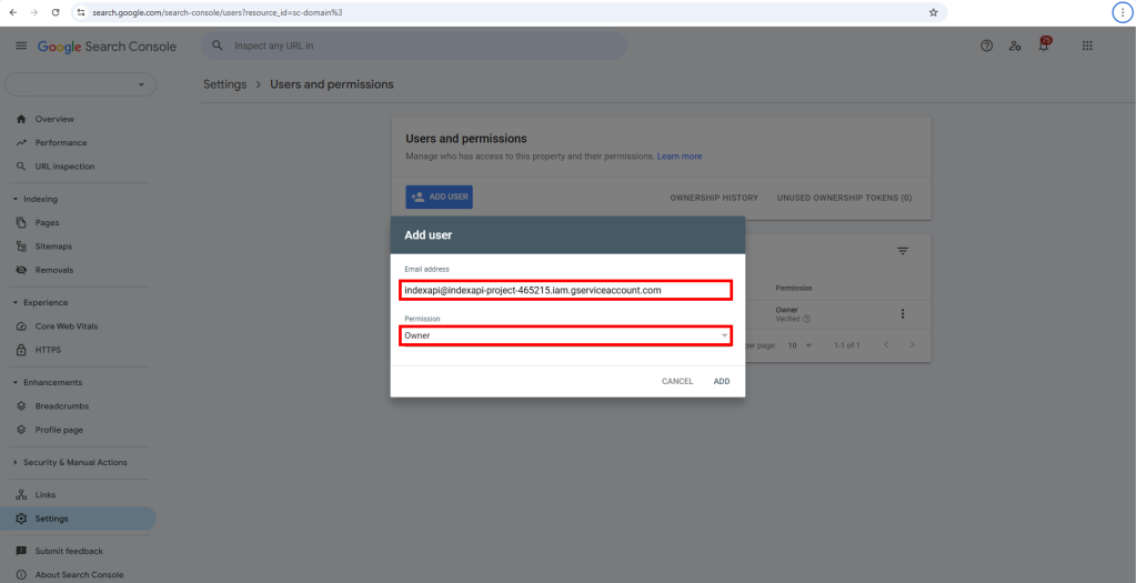 ایمیلی که کپی کرده بودید را در قسمت Email address وارد کنید و بخش Permission را حتما بر روی Owner قرار دهید.