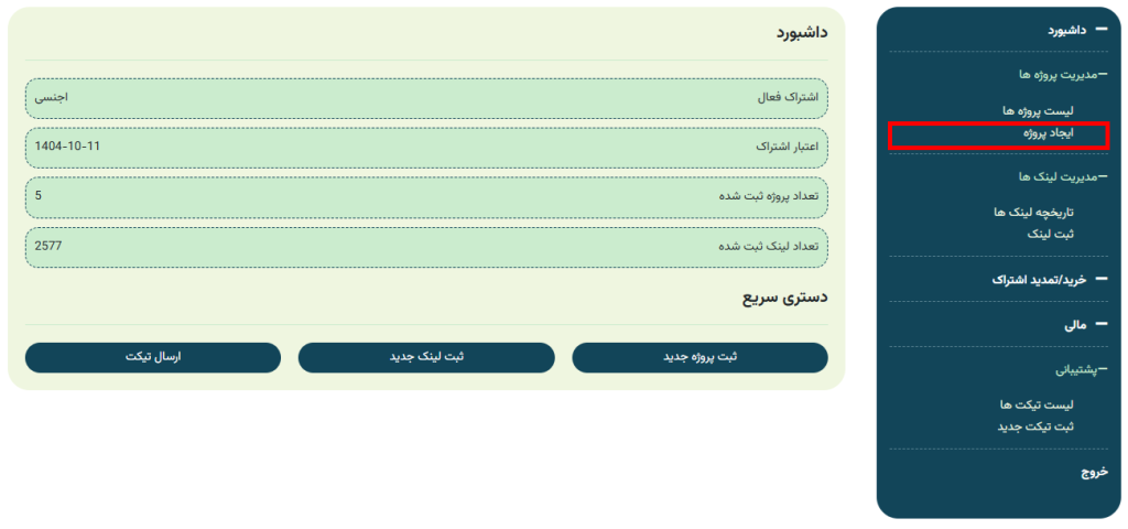 از بخش مدیریت پروژه، بر روی ایجاد پروژه کلیک کنید.