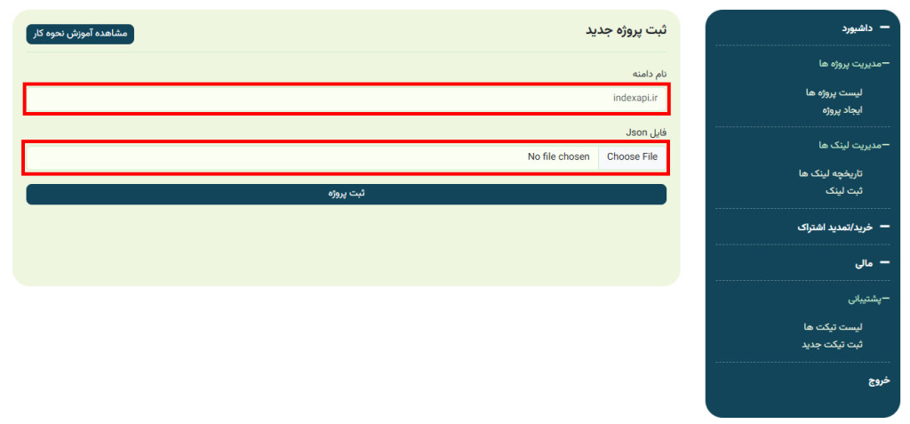 فایل json دانلود شده را نیز در قسمت مشخص شده بارگزاری کنید و بر روی ثبت پروژه کلیک کنید.