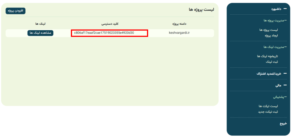 تبریک، پروژه شما با موفقیت ثبت شد و کلید دسترسی برای شما ایجاد شد. این کلید دسترسی برای اتصال به سرویس از طریق پلاگین وردپرس یا وب سرویس مورد نیاز است.