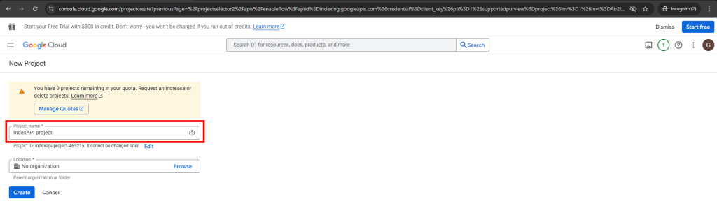 در این قسمت یک نام دلخواه برای پروژه خود انتخاب کنید. فرضا ما در این بخش نام پروژه را indexAPI project قرار دادیم. بخش Location رو تغییر ندهید و سپس بر روی دکمه Create  کلیک کنید تا به بخش بعدی بروید.
