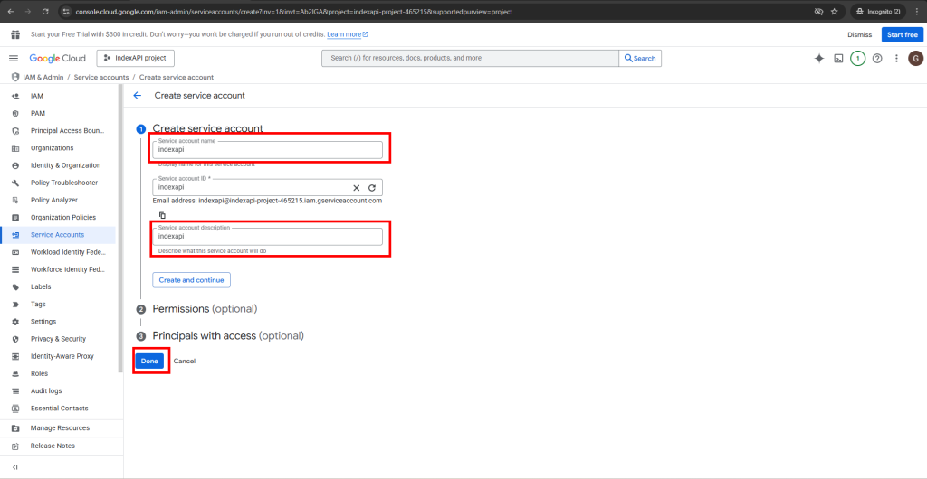 در بخش service account description هم توضیح دلخواه خود را بنویسید (میتوانید مقدار فیلد اول را تکرار کنید)